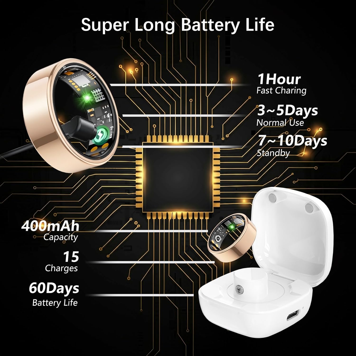 ✨[슈퍼 배터리 수명]: Smart Ring은 2시간 충전으로 최대 3~5일의 배터리 수명을 제공합니다. 우리는 400mah 배터리가 포함된 무료 휴대용 충전 케이스를 제공합니다. 이 케이스는 스마트 링을 약 15회 완전히 충전할 수 있어 사용 시간을 60일로 크게 연장합니다. 충전 케이스를 충전한 다음 이를 사용하여 스마트 링을 15회 다시 충전할 수도 있습니다. 출퇴근이 잦은 사람과 야외 활동을 즐기는 사람에게 이상적이며 어디에 있든 지속적인 건강 모니터링을 제공합니다.