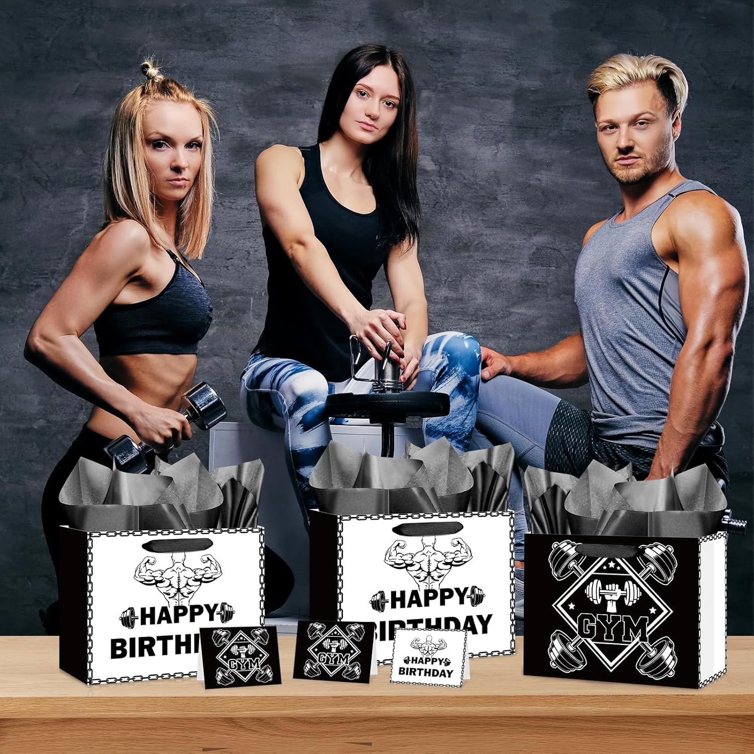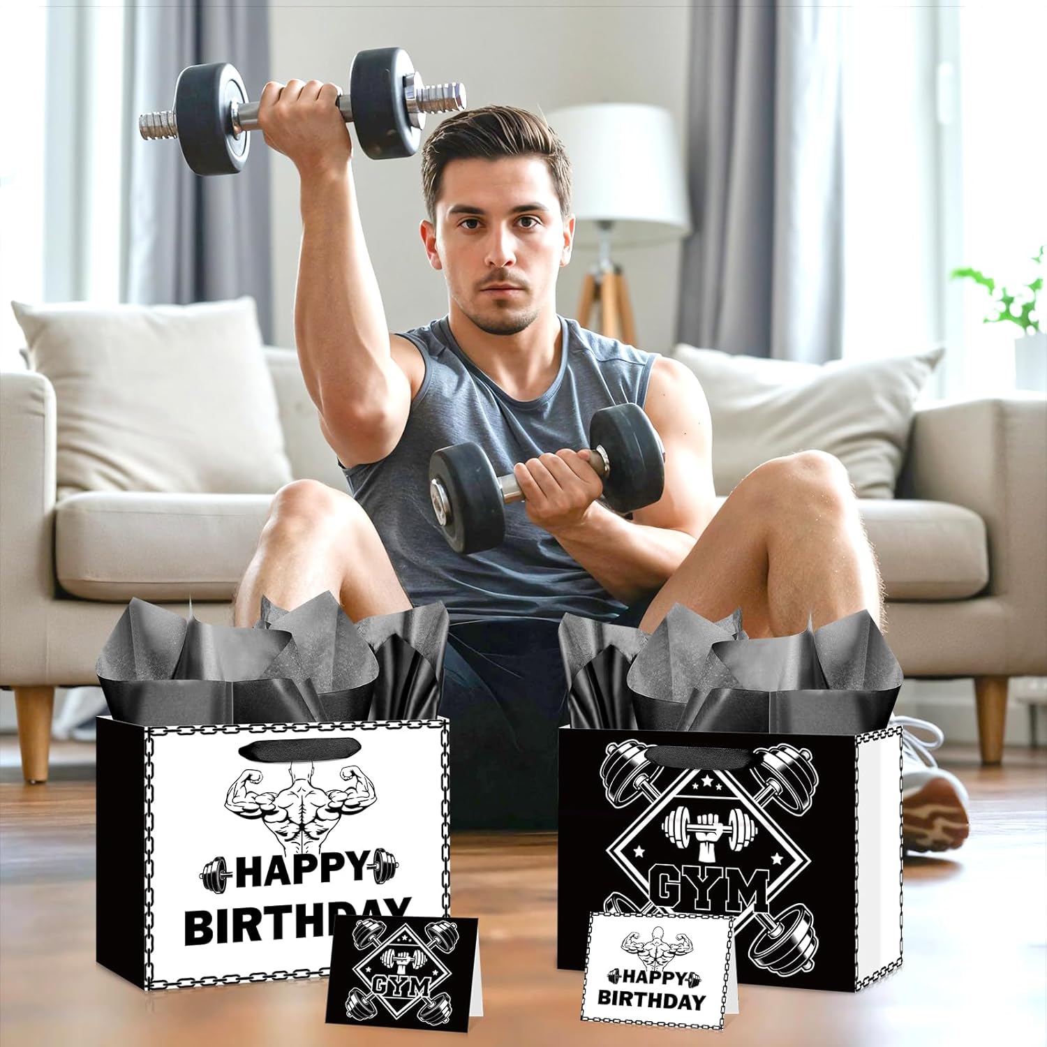 체육관 디자인의 주제. 이 생일 가방은 독특합니다. 전면에는 역도 그래픽 “생일 축하합니다”가 있으며 그 반대는 “체육관”멍청한 패턴을 보여줍니다. 이 다재다능한 흑백 계획