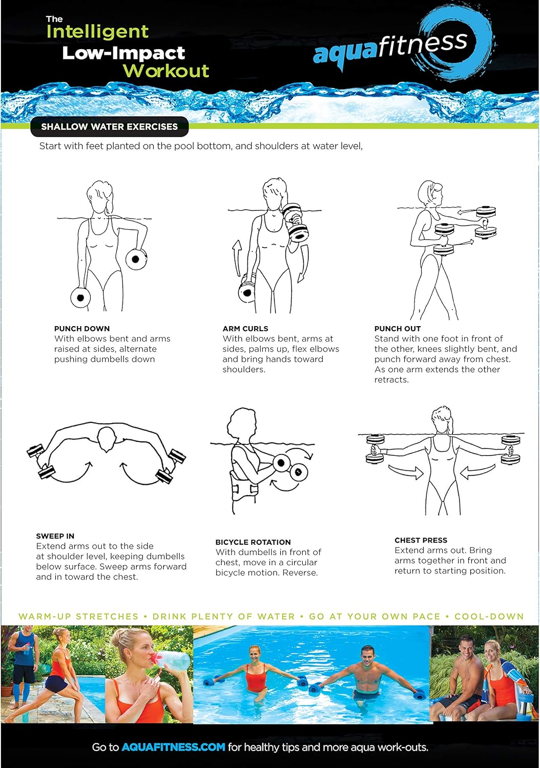 스타일: 디럭스 6피스 피트니스 세트아쿠아 피트니스(Aqua Fitness)는 충격이 적고 결과가 좋은 것으로 입증된 운동입니다. 근력 운동, 심장 지구력 및 칼로리 소모에 이상적입니다. 아쿠아 피트니스 트레이닝 시스템에는 편안한 부양 벨트, 저항 덤벨 2개, 메쉬 장갑 2개, 12가지 트레이닝 지침이 포함된 가이드 등 6개의 주요 부품이 포함되어 있습니다. 모든 물 장비는 염소에 강합니다. 14세 이상에게 권장됩니다. 윤곽이 잡힌 디자인으로 몸통 주위에 단단히 맞습니다. 하나의 크기가 모두 적합합니다. 얕은 물이나 깊은 물에 몸을 수직으로 매달아 놓습니다. 모든 체력 수준에 적합합니다. 12가지 운동 지침 가이드. 낮은 스트레스, 고성능 트레이닝 내염소성 EVA 폼 14세 이상에게 권장됩니다. 경고: 이 장치는 생명을 구하는 장치가 아닙니다. 장치를 사용하는 동안 어린이를 방치하지 마십시오. 운동을 시작하기 전에 항상 의사와 상담하십시오. 관리 및 관리 – 사용 후에는 깨끗한 물로 세척하고 완전히 건조시키십시오. – 제품을 직사광선에 장시간 노출시키지 마세요. -고객 만족을 위해 서늘하고 건조한 곳에 보관하십시오. 귀하의 만족은 우리의 궁극적인 목표입니다. 이것이 바로 모든 Aqua-Leisure 제품이 우리의 성능을 구현하는 이유입니다. 염소-염-브롬 함량이 높은 화학적으로 처리된 수영장이나 바닷물에서 자주 사용하면 패브릭 색상이 바랠 수 있습니다. 더 중요한 것은 상업용 수영장은 일반 주거용 수영장보다 염소, 소금 및 브롬 함량이 훨씬 높다는 것입니다. 제품 색상 및 그래픽은 이미지와 다를 수 있습니다.