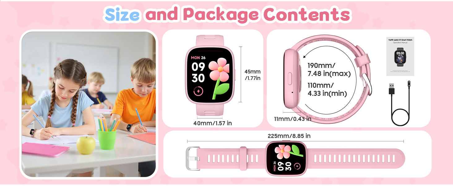 Universal Activity를 따르기 위해 Verfit Smart Watch는 자동으로 어린이와 청소년, 거리, 칼로리가 타거나 활성 시간을 따릅니다. 걷기, 달리기, 자전거 타기, 수영 (IP68 방수) 및 농구를 포함한 80 개 이상의 스포츠 모드를 지원합니다. 활동적인 아이들을위한 완벽한 동반자입니다.