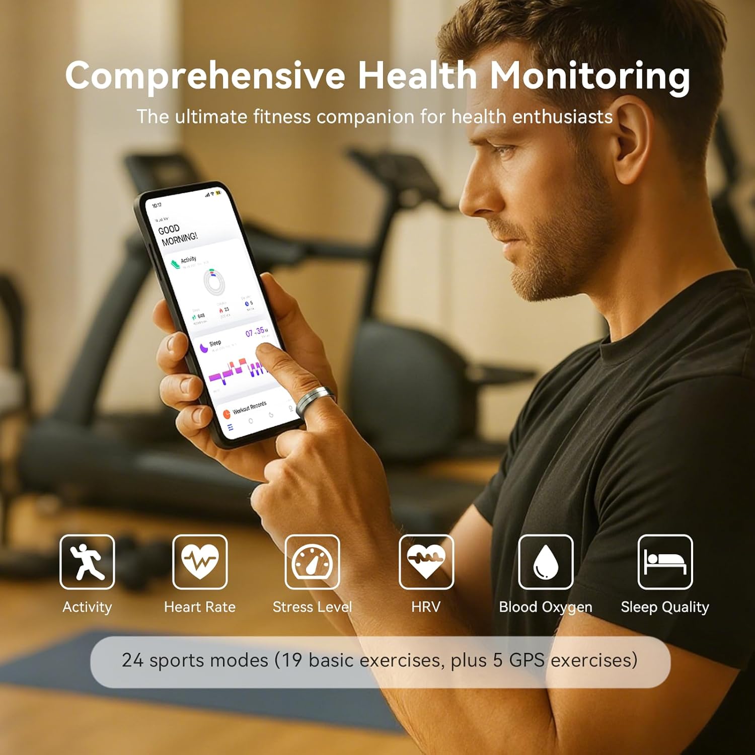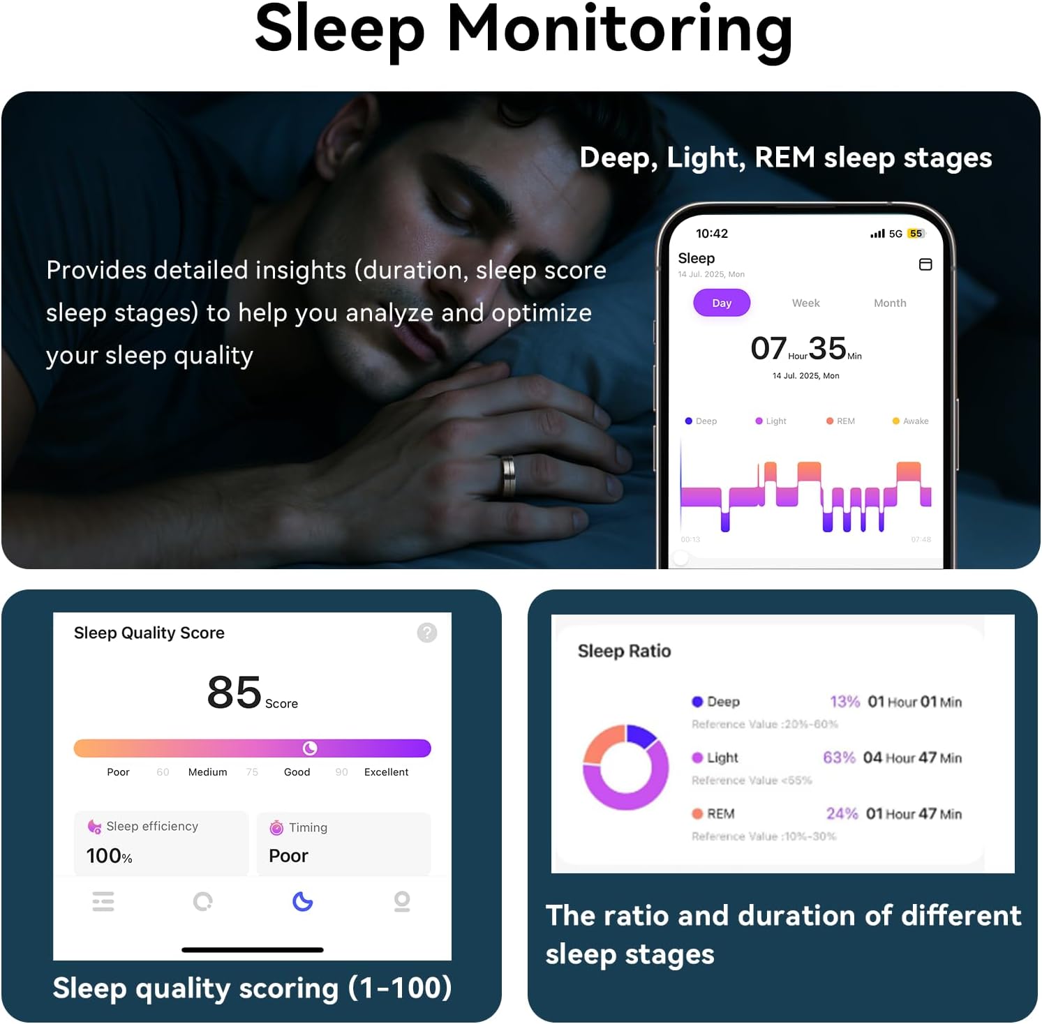 고급 건강 및 피트니스에 이어 심박수, 혈액 산소, HRV 및 스트레스 수준을 임상 등급 포인터로 볼 수 있습니다. 남성과 여성의 경우 스마트 링은 자동으로 수면 단계 (깊이, 가벼운, REM)를 따르고 휴식과 회복을위한 행동을 제공합니다.