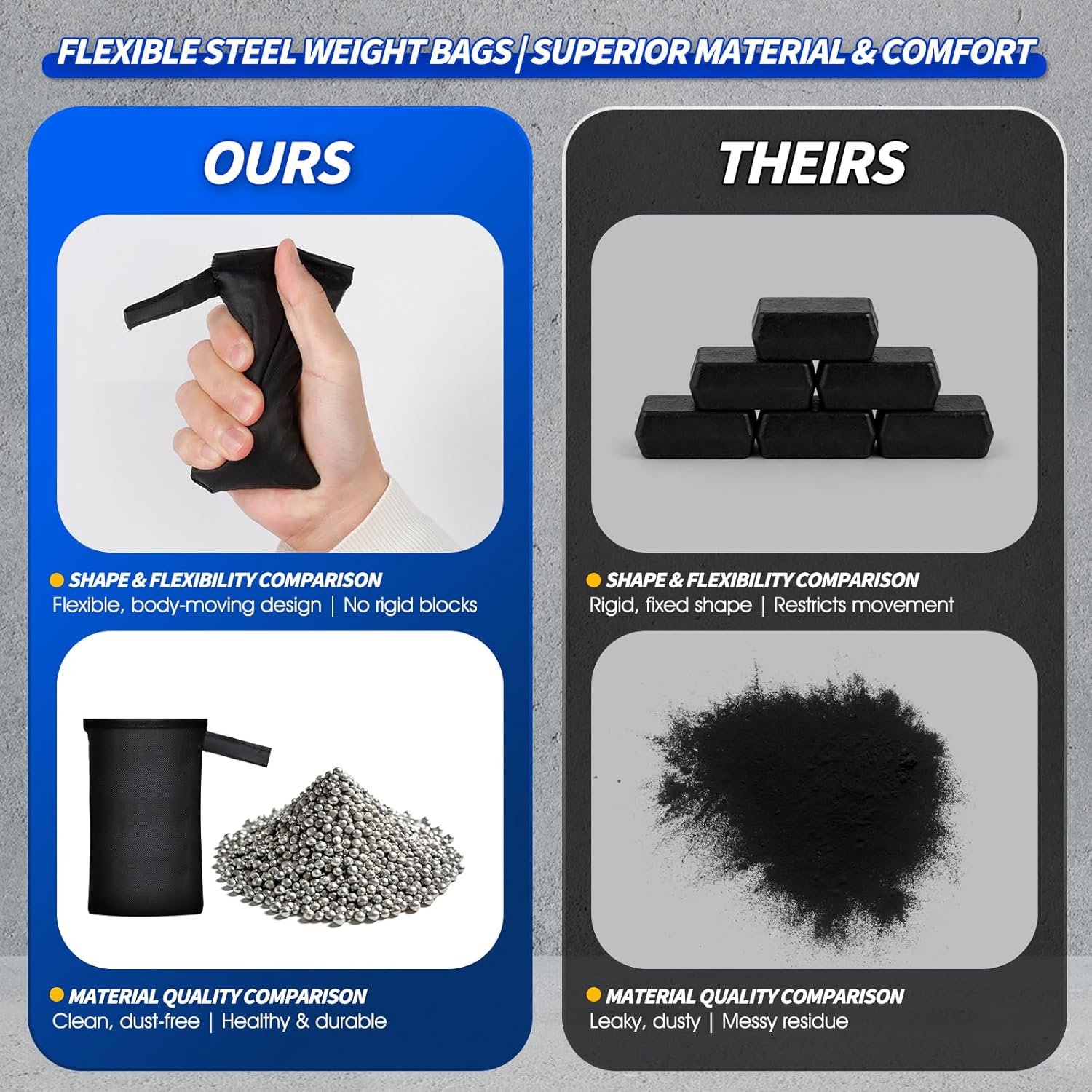 순수 강철 샷으로 무게를 2lb-10lb로 조절할 수 있습니다. 웨이트 백을 추가/제거하여 강도(2lbs-10lbs)를 맞춤화하세요. 고밀도 순수 강철을 채워 균일한 무게 배분을 제공하여 안정적이고 자연스러운 움직임을 제공합니다.