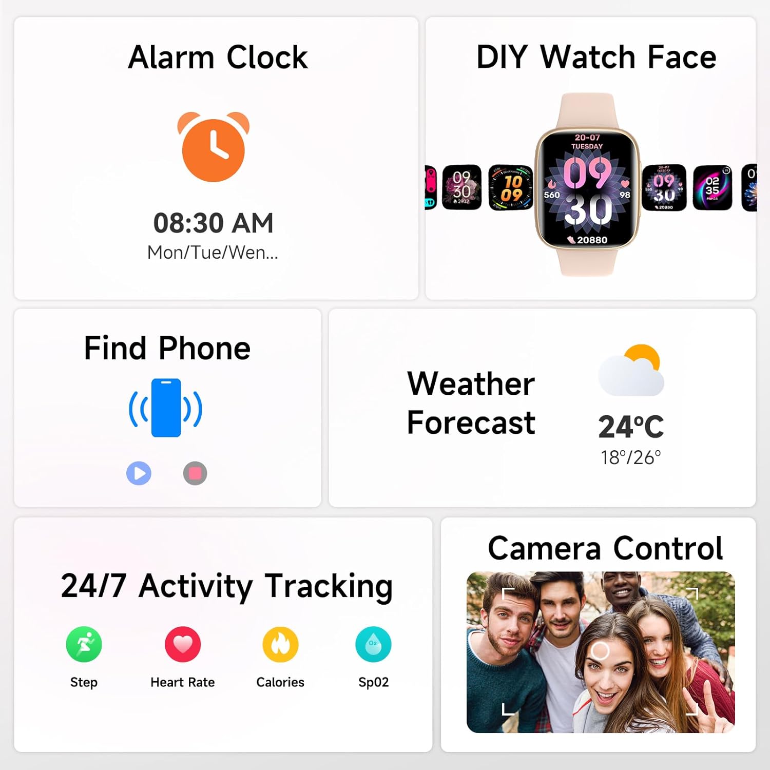 : 스마트 기능 및 미리 알림 : 물 수신 론자 미리 알림, 좌식 경보 및 월경주기를 유지하십시오. 음악을 제어하고 날씨 등을 확인하십시오.