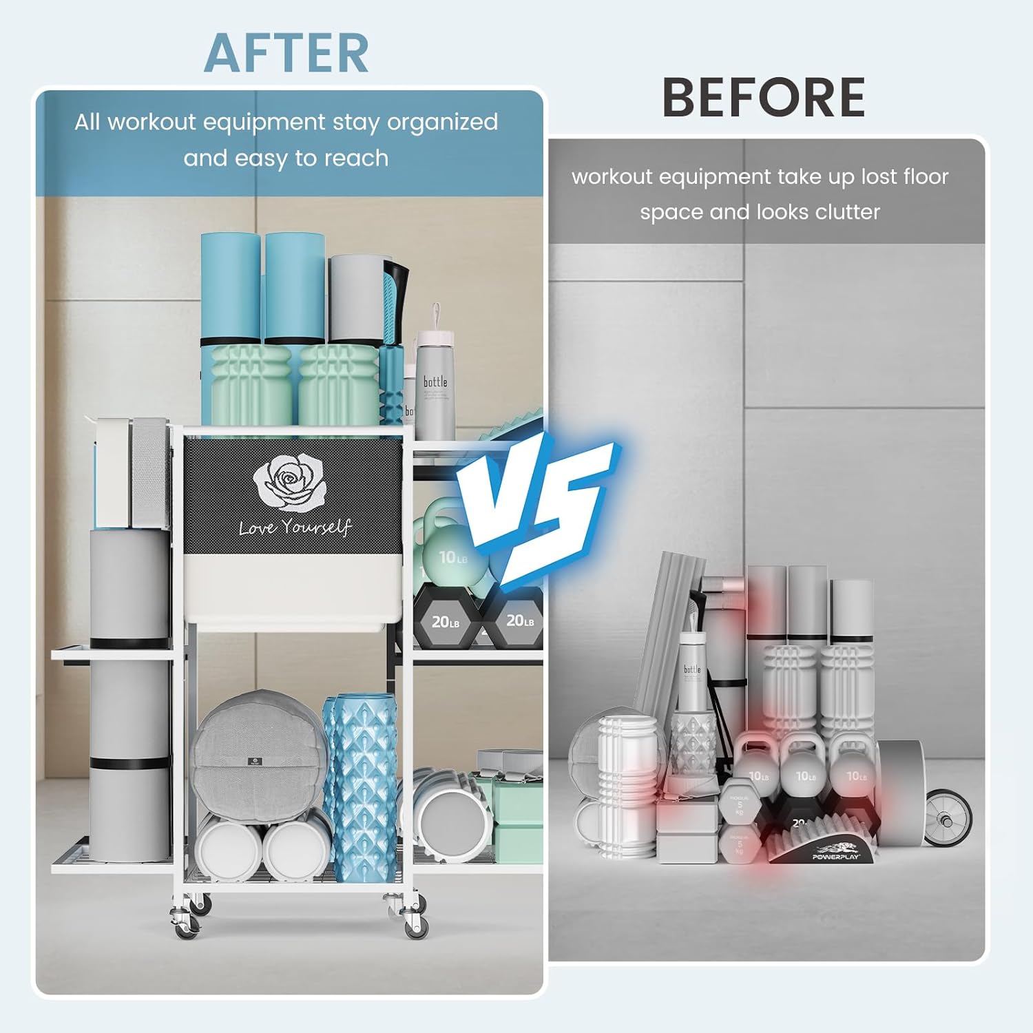 다재다능한 요가 매트 보관 랙으로 집에서 운동할 수 있는 공간을 한층 더 높여보세요. 운동 필수품을 깔끔하게 정리할 수 있도록 디자인된 이 세련된 랙은 2단 바구니와 확장된 측면 선반을 갖추고 있어 요가 매트, 블록, 롤러, 저항 밴드, 덤벨 등을 위한 충분한 저장 공간을 제공합니다.
