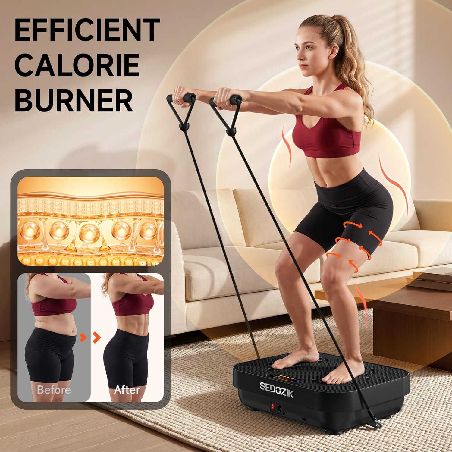 풍부하고 효율적인 기능. 업그레이드된 SEDOZIK 진동판 기계에는 다양한 훈련 요구에 맞는 8가지 마사지 모드(P0-P7)가 있으며, 1-120단계의 조절 가능한 속도와 저항 영역이 전신 순환을 자극하고 근육을 강화하며 곡선을 형성합니다.