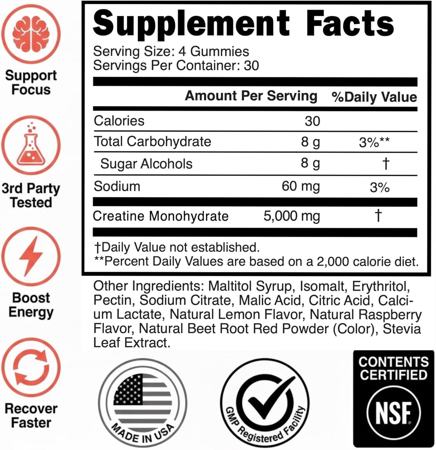 미국에서 제작되었습니다. ANP를 선택하면 성분의 우수성을 믿는 브랜드를 선택하게 됩니다. 이것이 바로 당사의 크레아틴 구미가 스포츠용 NSF 인증과 가장 순수한 크레아틴을 사용하여 미국에서 제조되는 이유입니다. ANP는 각 봉지에 30회 복용량과 함께 1개월 프리미엄 지원을 제공합니다.