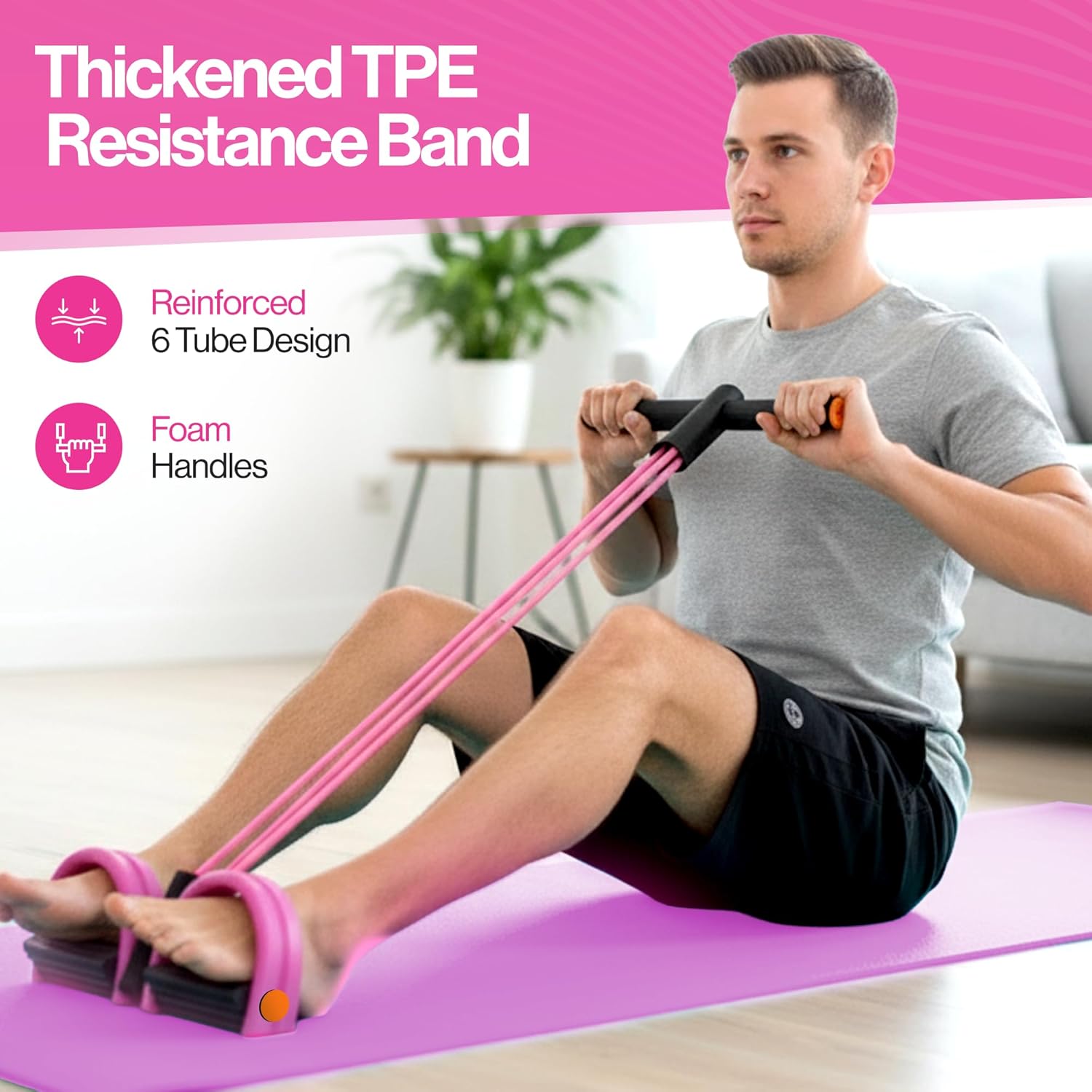 💪 [6-TUBE HEAVY DUTY TUMMY TRIMMER RESISTANCE] 4개의 강력한 탄성 라텍스 튜브로 구성된 이 풋 페달 저항 밴드는 최대 근육 참여를 위해 강화된 장력을 제공합니다. 기본 운동 밴드와 달리 이 적응형 복부 저항 밴드는 윗몸 일으키기, 풀업 및 근력 운동에 일관된 저항을 제공합니다. 집에서 체중 감량 운동과 복부 근육 강화에 적합합니다.