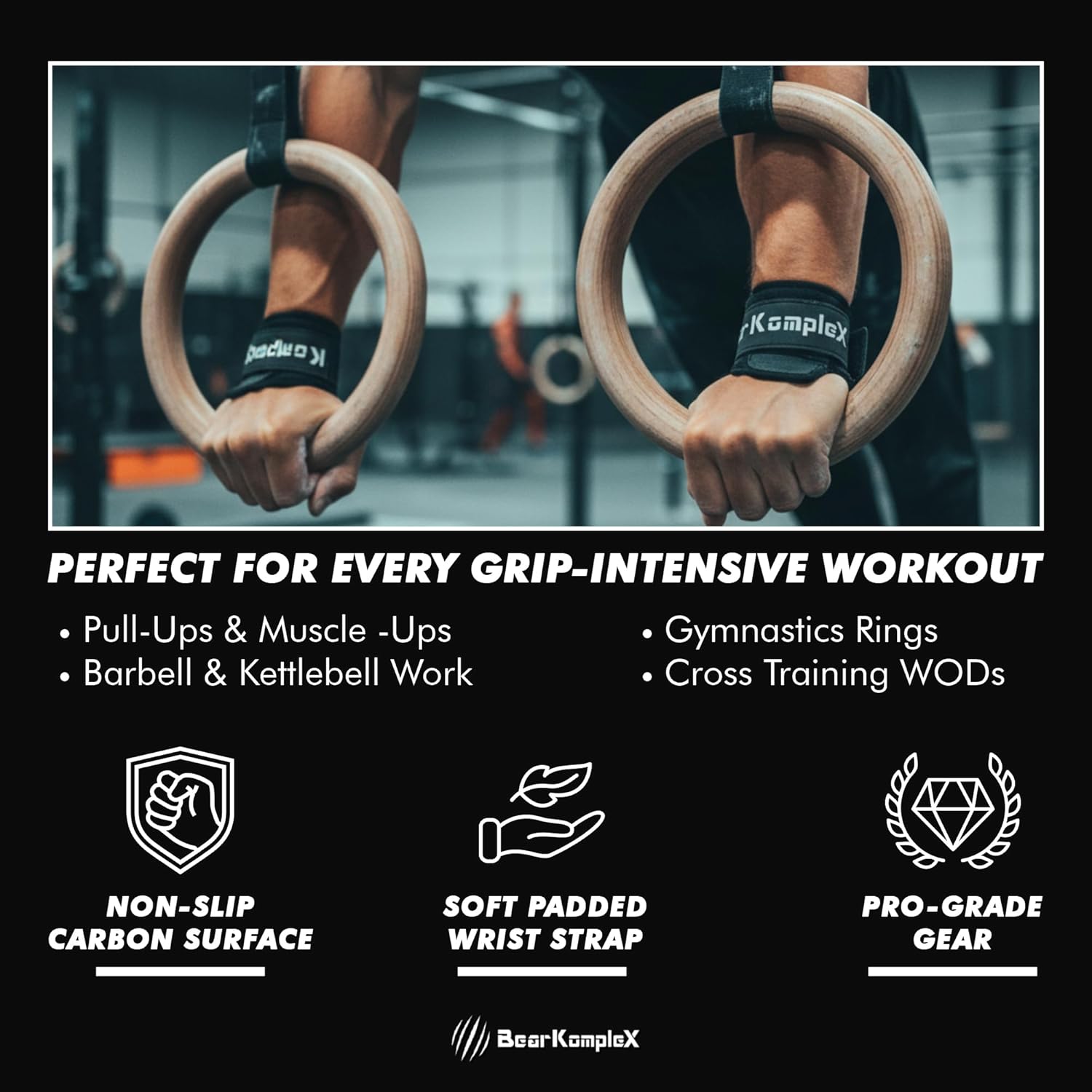 무거운 풀업부터 고강도 운동까지 Bear Komplex 그립과 스트랩은 피로가 쌓일 때에도 고정 상태를 유지하는 데 도움이 됩니다.
