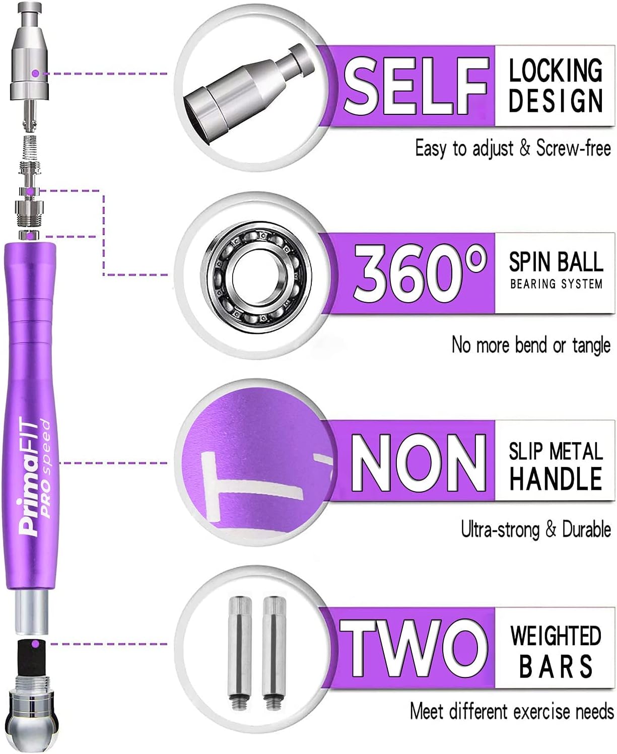 PrimaFit Pro Speed Premium Weighted Skipping Rope는 빠른 2 볼 베어링 시스템, 피트니스 훈련, 지방 연소 유산소 운동, 복싱, 컨디셔닝, 무술, Crossfit, MMA, HIIT 및 DoublesD 훈련을 위한 이상적인 홈 체육관 장비를 갖춘 전문적으로 조절 가능한 줄넘기 로프입니다. 17.5cm 길이의 손잡이는 고품질 알루미늄 합금으로 만들어져 손잡이를 실수로 떨어뜨려도 손상되지 않습니다. 장시간 운동으로 손바닥에 땀이 흘려도 줄넘기는 미끄러지지 않습니다. 독특한 자동 잠금 설계 덕분에 먼지 제거가 몇 초 만에 이루어지며 스피드 로프는 키가 크거나 작은 운동선수를 포함하여 누구나 사용할 수 있습니다. 절단이 필요하지 않습니다. 누구에게나 적합 – 남성, 여성, 어린이, 복서, 프로 운동선수 또는 초보자. 엉킴 방지 및 PVC 코팅. 고강도 꼬인 강철 와이어로 만들어져 로프의 내구성과 내구성이 더욱 향상되었습니다. 추가 보호 – 단단한 표면을 위한 2개의 로프 보호 장치가 포함되어 있습니다. 작고 가벼운 이 성인용 로프는 지방을 최대로 연소하고, 근육을 탄탄하게 하며, 어디에서나 최대의 체력을 달성하는 데 도움이 됩니다. 손잡이에 내장된 추가 무게추는 쉽게 분리할 수 있습니다. 점프할 때 3가지 유형의 무게추를 제공합니다. 1) 추가 무게 없이 점프하기 2) 금속 상단 끝이 부착된 점프하기 – 무게 추가하기; 3) 보다 효율적인 훈련, 빠른 점프 및 팔과 어깨 훈련을 위해 40g 무게로 점프합니다. 컬렉션에서 무엇을 얻나요? 인체 공학적으로 모양이 새겨져 있는 알루미늄 미끄럼 방지 손잡이 2개 – 각 17.5cm PVC 보호 코팅이 있는 강철 와이어 2개 – 각 3m; 케이블 직경 – 3.0mm 로프 보호기 2개 – 각 30cm PrimaFit 브랜드 가방 추가 무게 2pcs x 40g 고무 O-링 4개 우아한 패키지 – PrimaFit 단단한 종이 럭셔리 선물 상자 – 가족과 친구에게 선물로 이상적