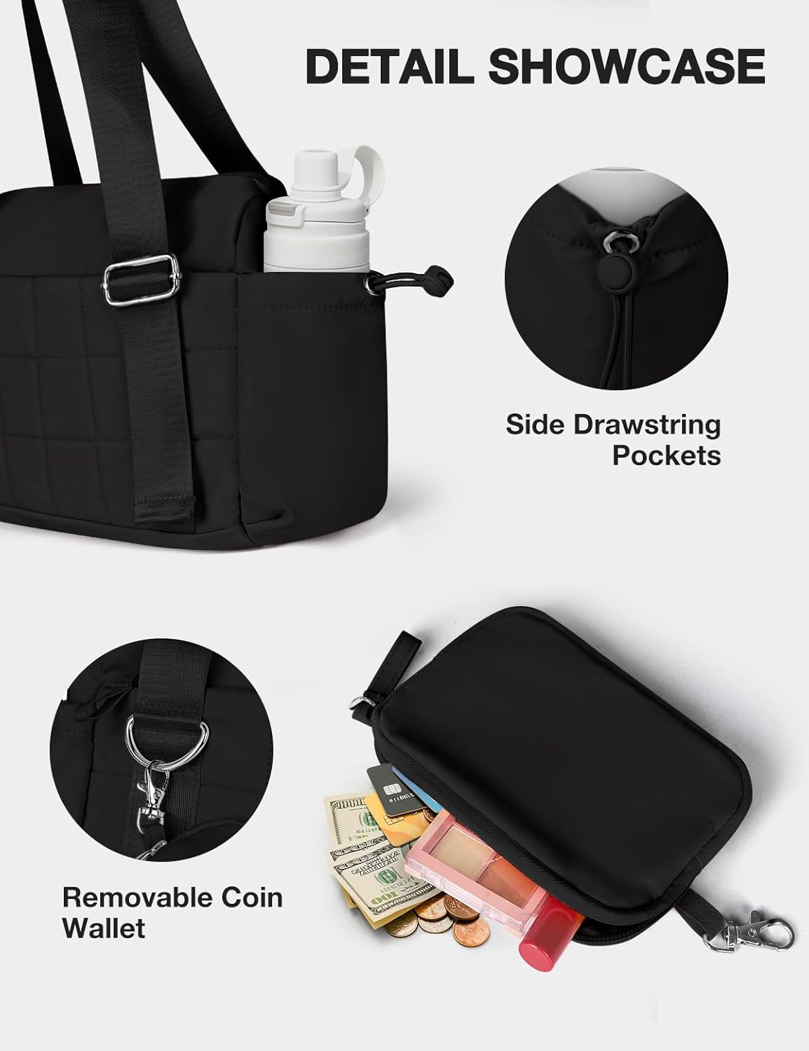 놀랍게도 관대 한 보관. 미니 크기가 당신을 속이게하지 마십시오. 이 가방은 체육관 의류, 아이 패드, 물병, 헤드폰, 화장실 및 기타 일일 기본 요소를 효과적으로 착용하는 넓은 저장 공간을 제공합니다.