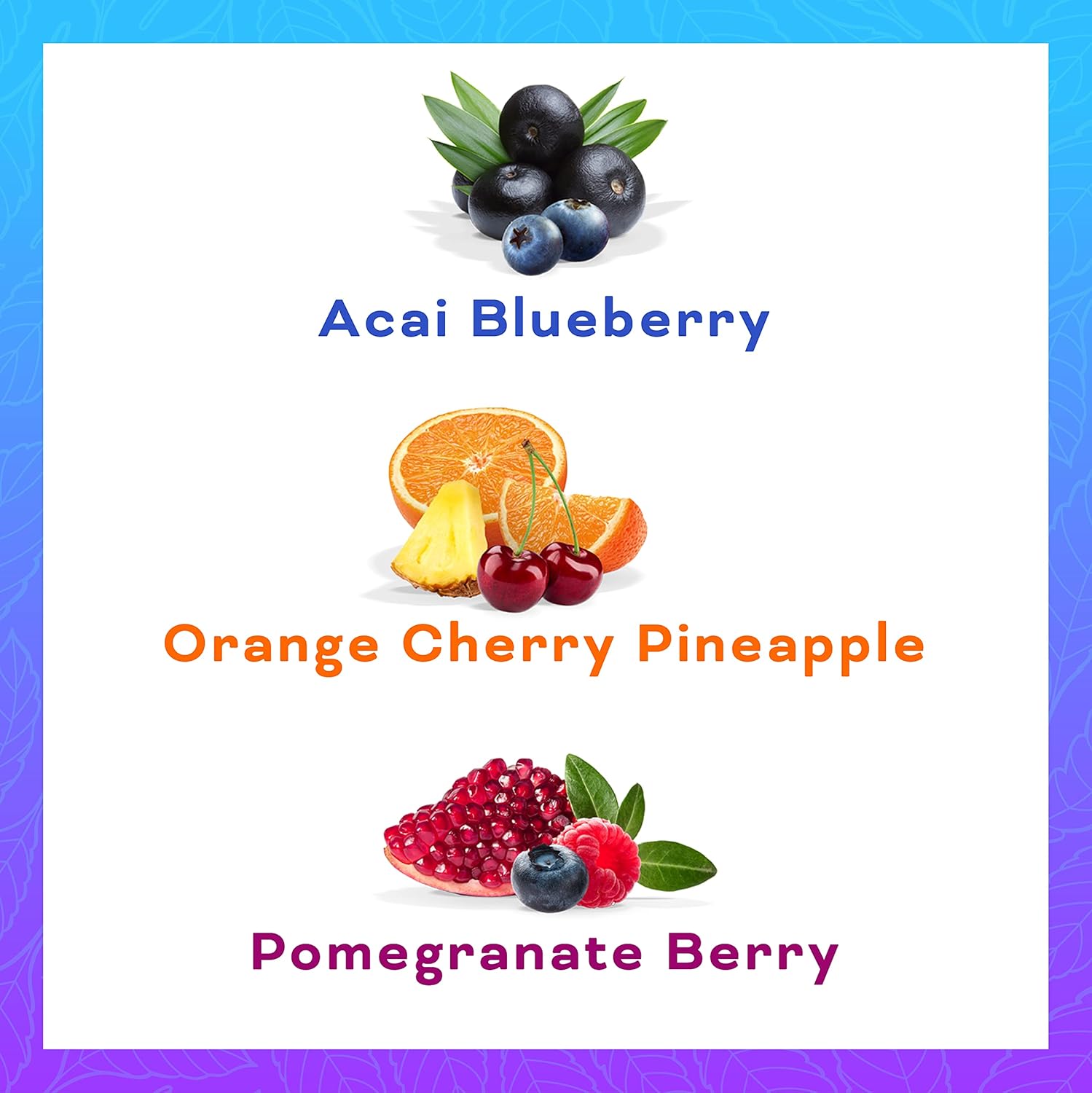 맛있는 맛 – 12팩 퍼포먼스 팩에는 아사이 블루베리, 오렌지 체리 파인애플, 석류 베리 등 가장 인기 있는 다양한 맛이 포함되어 있습니다. 모두 무설탕, 무칼로리, 무GMO, 인공 감미료, 무가당, 적절한 양의 맛을 자랑합니다.